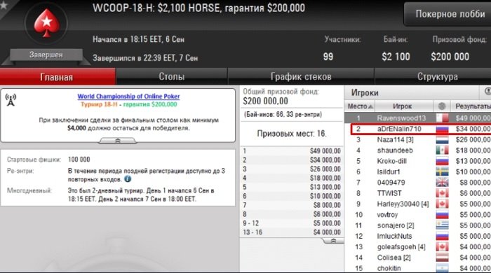 На данный момент россиянин занимает первое место в общем зачете лидеров WCOOP. PokerStars подарит «aDrENalin710» трофей, а также Platinum Pass за его достижения на серии.