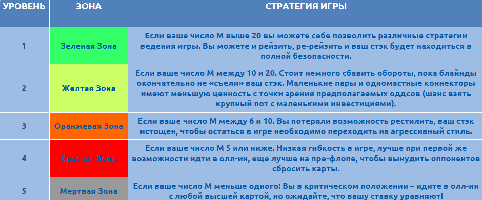 Как же начинающему игроку выбирать оптимальную стратегию, зная показатель? Есть специальные руководства по выбору стиля игры в соответствии с конкретным значением М. Опытные игроки разработали рекомендации по выбору стартовых рук и стилю ведения торгов для нескольких диапазонов размера показателя. Первым это сделал вышеупомянутый Дэн Харрингтон – выдающийся турнирный покерный игрок и один из первых теоретиков покера. Он разбил диапазоны числа на зоны, каждой из которых для удобства присвоил определенный цвет.