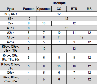 Использовать данную таблицу, составленную на основе теории великого математика Нэша, довольно просто и здесь даже не нужно рассчитывать М. Сам показатель важно знать, чтобы определить – в какой Вы зоне, а дальше Вам пригодится только знание того, сколько Больших блайндов в Вашем стеке. В верхней шапке таблицы указаны позиции, в левой – карты или их диапазоны. В соответствующих столбцах – число Больших Блайндов, содержащихся в стеке игрока, при котором с указанными картами следует ставить ва-банк в той или иной позиции.