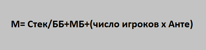 Судя по способы вычисления, М показывает – сколько обязательных ставок содержится в стеке игрока, который он оплачивает за один полный круг. Следовательно, для его определения необходимо разделить количество фишек на сумму всех ставок вслепую – Блайндов и Анте. Получается следующая простая формула: