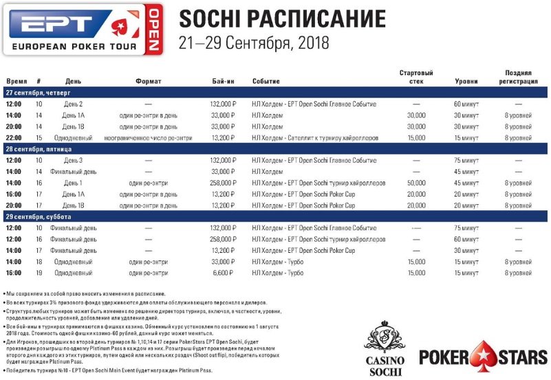 Победитель Мейна кроме призовых и кубка получит Platinum Pass на $30,000. Организаторы также обещают, что в турнирах EPT Open Sochi примут участие и члены команды профессионалов Старзов.