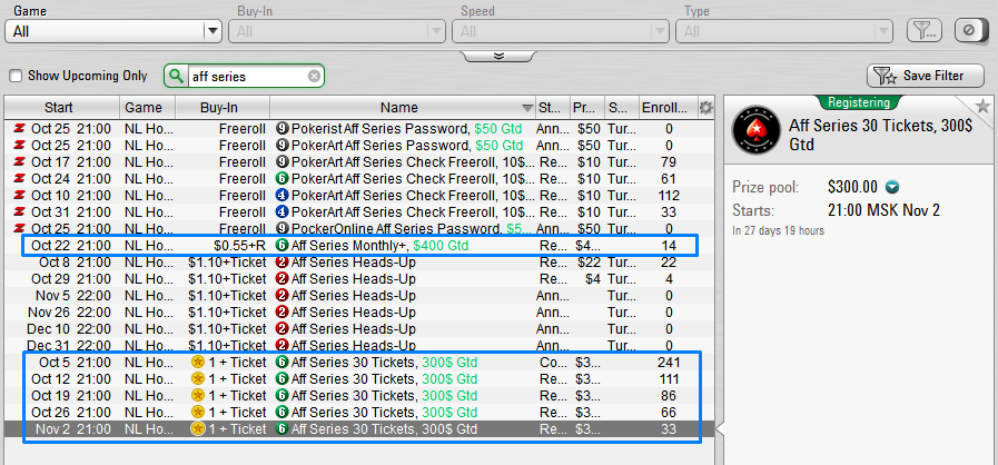 Найти все эти турниры можно в закладке Турниры-Частные (Tournaments — Private). Для их поиска удобнее всего использовать тег — Aff Series.