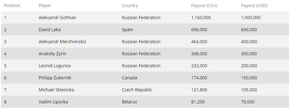 Крупнейший турнир, прошедший за всю историю российского покера выиграл Александр Гофман из Екатеринбурга! Игру за финальным столом он начинал с 7-ого места по количеству фишек в стеке, что значительно усложнило его путь к победе и выигрышу 58 миллионов рублей (1 000 000$). Основное соперничество, вплоть до финального хэдз-аппа ему составлял победитель турнира хайроллеров PartyPoker Million — испанец Дэвид Лака, который остановился всего в шаге от второй победы на данной покерной серии.
