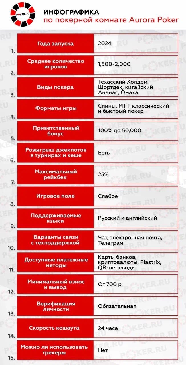 Аврора Покер — новая онлайн-комната для русскоязычной аудитории. Она предлагает клиентам привлекательные условия для игры — от большого выбора дисциплин и форматов до выгодных бонусов и рейкбека. Команда Poker.ru подготовила инфографику, в которой отражена ключевая информация по Aurora Poker.
