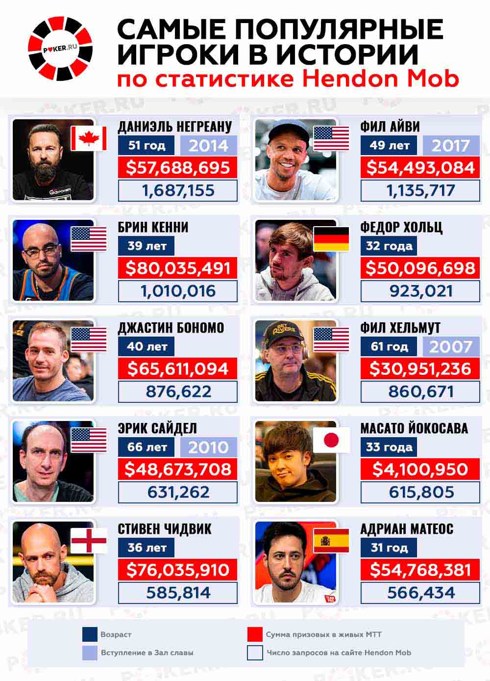 Hendon Mob — это платформа, собирающая статистику по всем официальным офлайн-турнирам в мире. Она хранит информацию о достижениях всех игроков, что помогает отслеживать их успехи. Но есть на сайте и другие рейтинги, позволяющие рассмотреть индустрию в не самых привычных разрезах, в том числе с точки зрения самых популярных покеристов.
