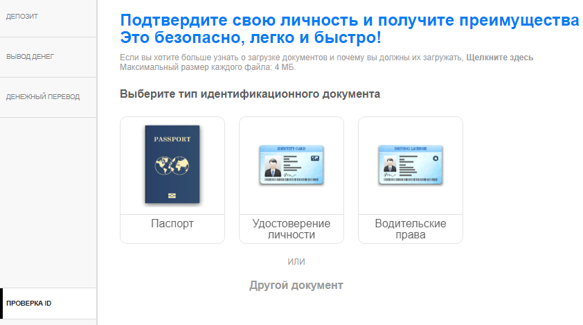 Важный раздел в функционале игрового счета — Проверка ID. Зайдя в него, Вы сможете загрузить сканы удостоверения личности для прохождения верификации. Обратите внимание на требования к фото или сканам. Крайне рекомендуется начать процесс проверки личности сразу после регистрации в покерной комнате. Проверка личности является обязательным требованием для всех игроков и проводится неукоснительно при первом выводе средств, что приводит к его задержке. Если пройти её заблаговременно, первый вывод денег не будет задержан по причине проверки документов.