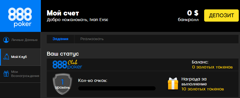 После авторизации перед Вами откроется лобби приложения. Чтобы открыть личный кабинет 888Poker, нажмите Мой профиль, и перед Вами откроется меню, предлагающее несколько различных вкладок. Профиль совмещен с кассой и чтобы войти в неё следует выбрать раздел Мой счёт. Перед Вами откроется информативное окно, сообщающее об игровом балансе, статусе VIP-уровня и прогрессе накопления бонусных очков.