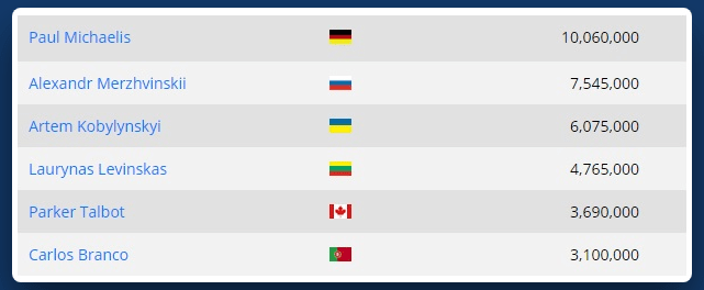 Однако на финальный стол удалось пробиться только Александру Мержвицкому и Артему Кобылинскому. Перейдя в шестой день, они уверенно держатся в тройке лидеров, лишь немного уступая в стеке немцу Полу Михаэлису.