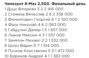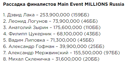 По количеству фишек лидирует профессиональный игрок — Дэвид Лака, который уже имеет одну крупную победу на PartyPoker MILLIONS Russia, а именно — в турнире хайроллеров. Его стек значительно превышает фишки соперников и дает потенциал на второй крупный трофей. Вчерашний лидер Карен Арутюнян вылетел на 9-ом месте, получив призовые в 58 000$. Чипкаунт финального дня Главного События следующий: