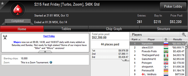 Fast Friday — эксклюзивный пятничный турнир на PokerStars с бай-ином в $215 и гарантией в $40.000 в редком для турниров Zoom формате. Подобный турнир начавшийся в пятницу 13-ое смог выиграть игрок из России.