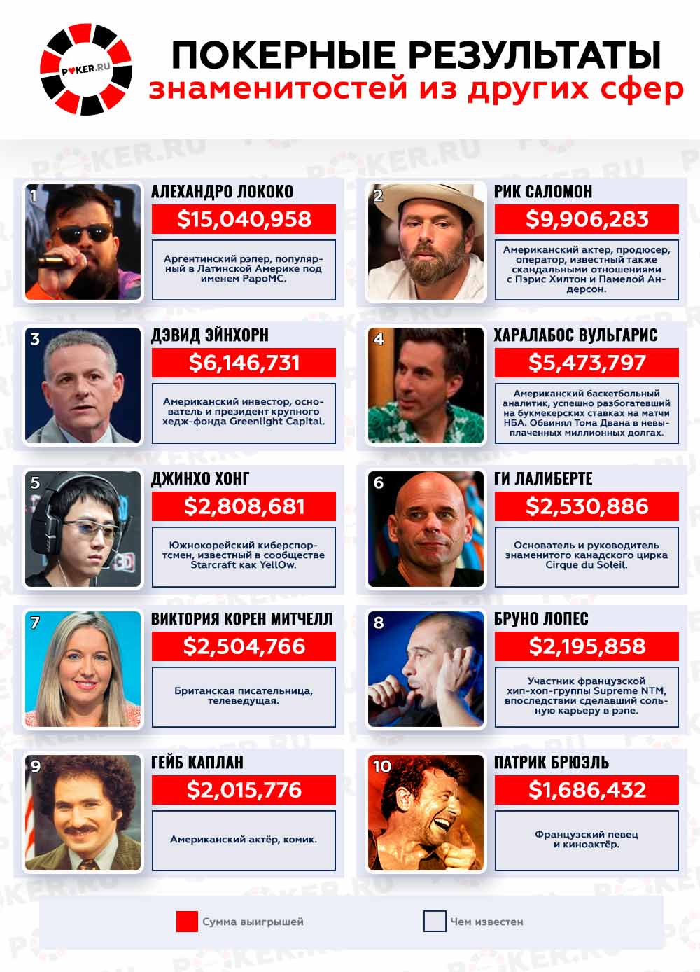 Профессиональное покерное сообщество может показаться довольно многочисленным, однако в действительности доля регуляров за столами любого рума или казино редко превышает 5%. То есть большую часть любого поля составляют любители. Среди последних есть немало игроков, известных достижениями в других сферах. Некоторым из них отношение к карточным дисциплинам как к хобби не помешало достичь внушительных результатов в живых турнирах.