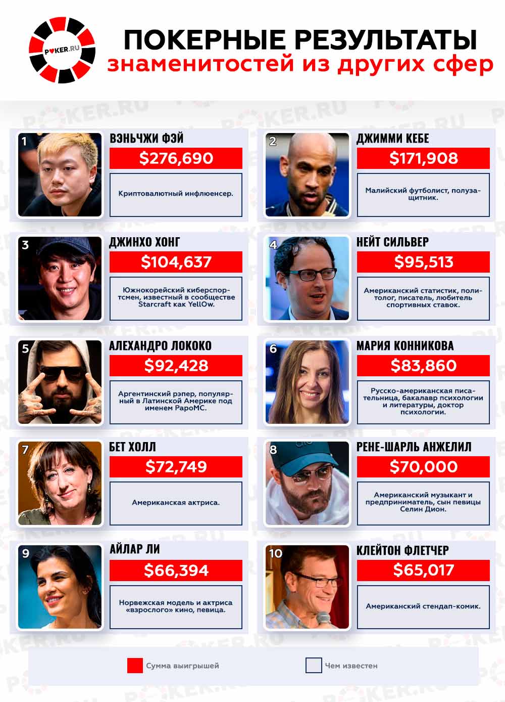 Таким образом, покер — это не столько профессиональный вид спорта, сколько увлекательная игра, объединяющая миллионы любителей по всему миру. И знаменитостям из других областей также свойственно желание испытать удачу в соревнованиях, в том числе в ходе официальных фестивалей.