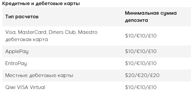 Для большинства платежных систем на 888Poker минимальный депозит составляет 10$ или 10 евро для методов в данной валюте, однако есть и исключения. Из следующих таблиц Вы можете узнать, какой минимальный депозит на 888 Покер установлен для разных методов платежей: