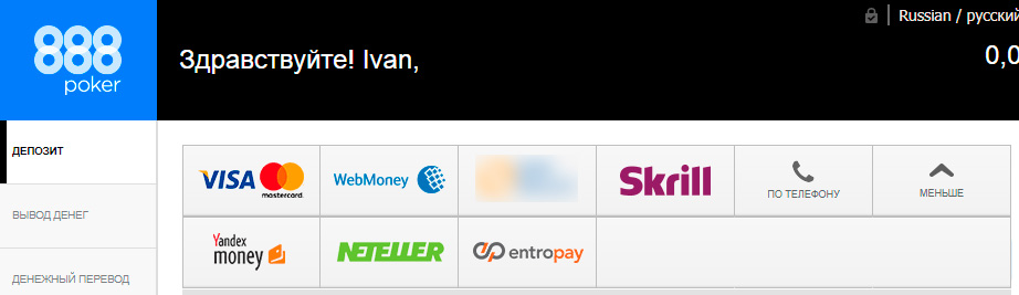 Чтобы играть на деньги в одном из самых надежных и популярных покер-румов, Вам нужно внести стартовый банкролл, который станет доходными инвестициями в игру, если Вы умеете играть по стратегии. Чтобы пополнить счет на 888Poker можно использовать популярные платежные инструменты, в том числе рублевые карты и кошельки. Минимальный депозит на 888 Покер равен всего 10$ для большинства платежных методов — довольно доступная сумма для широкого спектра игроков.