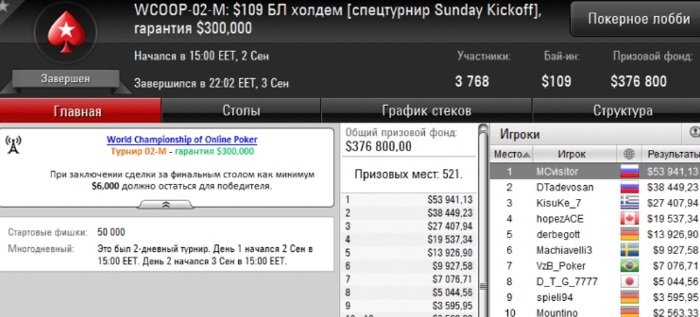 Игроки из России “MCvisitor” и “DTadevosan” взяли первое и второе места в турнире Sunday Kickoff за $109. Их выигрыши составили $53,941 и $38,449 соответственно.