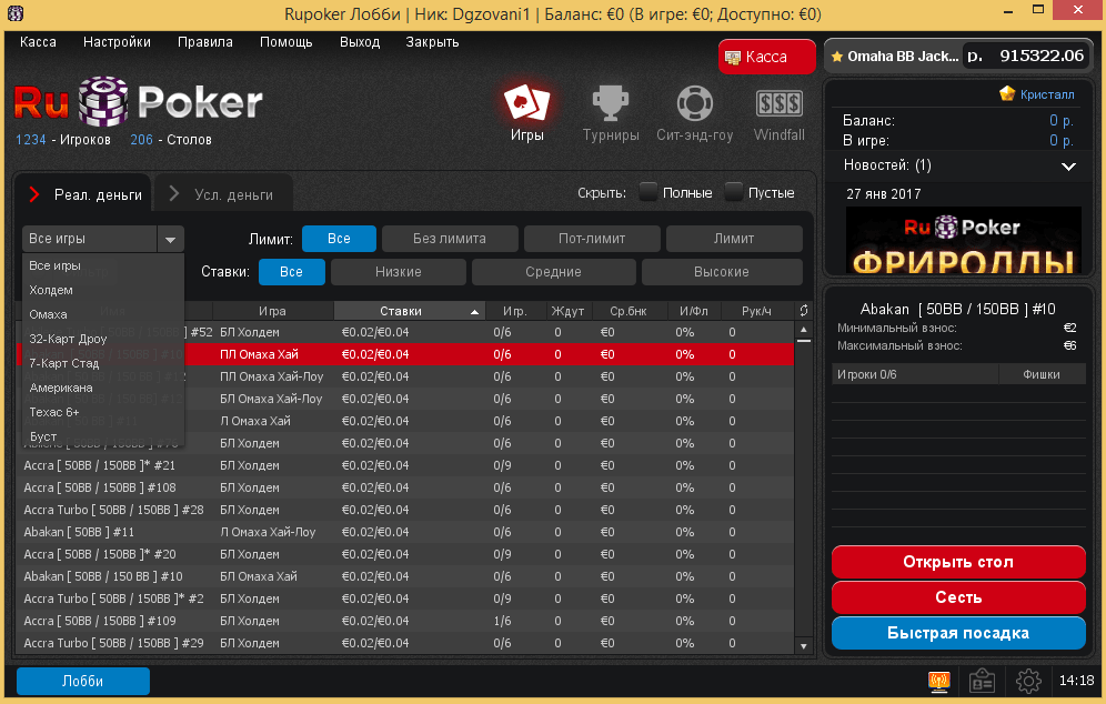 - Кэш-столы – ставки от 1/2 до 3000/6000 рублей с популярными и экзотическим видами покера. Столы с Холдемом и Омахой всегда пользуются популярностью, активная игра часто ведется в покер Американа и 32-карточый Дро. Доступны также семикраточные дисциплины и Бадуги;