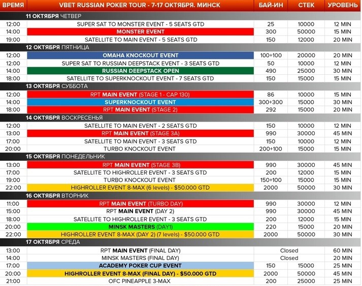 Russian Poker Tour (RPT) при поддержке Vbet Poker стартовал 7 октября в казино “Опера”, Минск. Уже завершилось 4 турнира из 14 событий, которые пройдут на нынешней серии RPT до 17 октября.