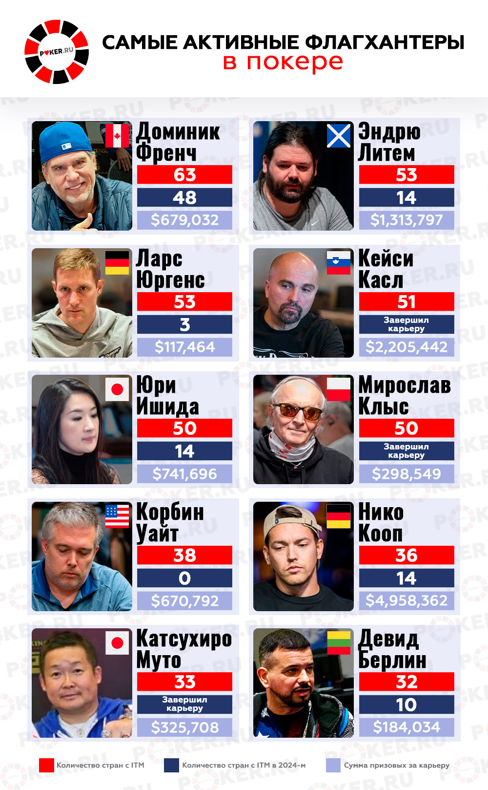Кроме крупных международных фестивалей покерная индустрия предлагает множество локальных серий. Обычно в них участвуют местные регуляры и любители. Однако некоторые профессионалы чаще других перемещаются между соревнованиями, постоянно расширяя географию своих выступлений. Их называют флагхантеры — охотники за флагами, то есть за количеством посещенных стран. В инфографике — самые активные путешественники из мира покера, собравшие призовые в наибольшем числе разных государств.
