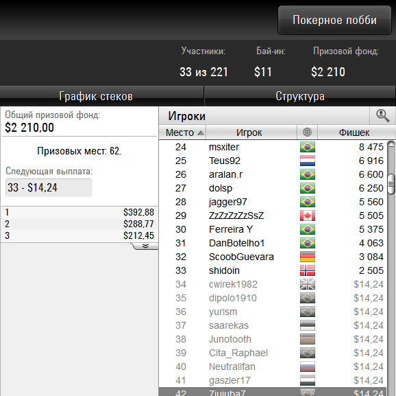 Вы находитесь в предельно печальном положении, так как Ваш стек не представляет угрозы для большинства соперников и это нужно помнить, принимая любое решение! Вы не можете использовать тактику в торгах, ведь на любой прием у Вас не хватит фишек. Зональная стратегия МТТ турнирного покера рекомендует одно — пойти ва-банк в любой благоприятной ситуации (более или менее перспективные карты) или сбросить. Конечно, ставить всё лучше находясь перед блайндами, когда после Вас останется минимум игроков. Спектр рук в поздней позиции, при условии, что перед Вами не было повышений, необходимо значительно расширить. Крупные карты в поздней позиции с любой другой становятся играбельными. Риск того, что блайнды сравняют ставку — велик, но они это будут делать со случайными картами. Здесь вся надежда только на удачу!