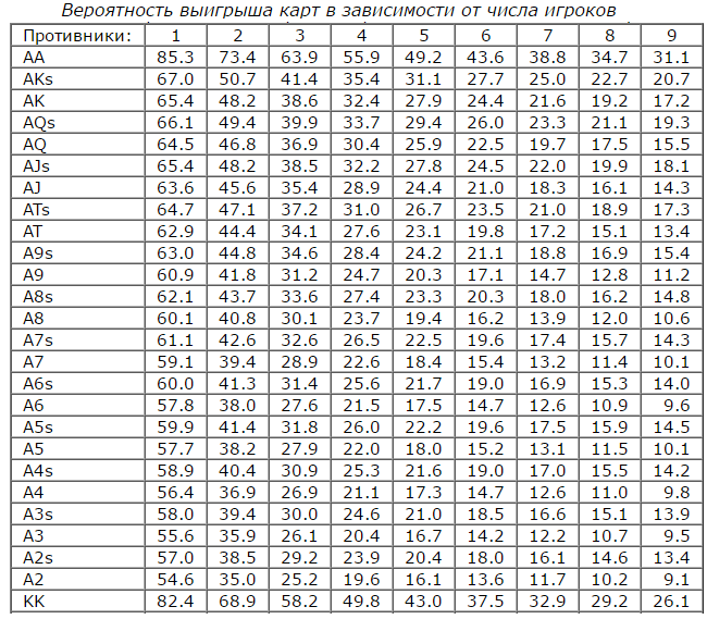 Недостатков у такого стиля много! Играя только с самыми лучшими стартерами в любых позициях, невозможно получить прибыль в покере. Тем более что игрок становится предсказуемым для соперников. Они, в свою очередь, часто забирают банк блефом, когда тайтовый игрок не получает комбинации и не вкладывают в банк, когда он составляет сильный расклад. Входя в торги на префлопе с хорошими картами, новички часто делают это Лимпом – они не повышаются, а ставят Бет. Таким образом, они создают благоприятные условия для мультипота – входа в торги более двух соперников. Из-за этого сильно снижается ценность даже самых сильных стартовых карт. Как количество соперников на префлопе влияет на перспективность стартовой руки, Вы можете узнать из таблицы: