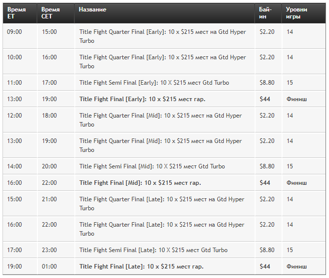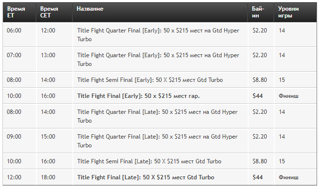 Бай-ин в воскресном событии Title Fight стоит 215$, что не по карману многим игрокам. Однако ПатиПокер организовал целую серию ежедневных сателлитов с разными бай-инами, через которые Вы можете пройти квалификацию в главный турнир недели поэтапно или напрямую. Стоимость участия в отборочных турнирах начинается от 2,2$ и достигает 44$. Вы можете сами выбирать, с какого этапа начинать отбор, учитывая возможности своего банкролла и умение выигрывать в турнирном покере. Расписание турниров с понедельника по субботу следующее: