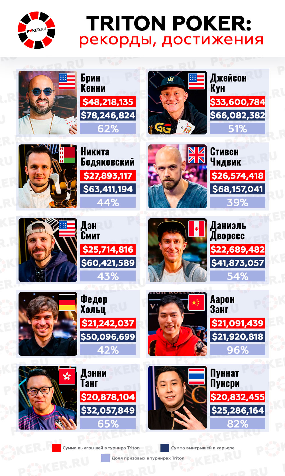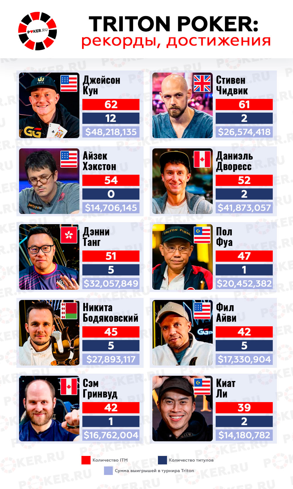 Заметно, что успехи в турнирах серии Triton Poker во многом определили позиции хайроллеров в общем рейтинге во всех соревнованиях в покерной индустрии. Так, Брин Кенни и вовсе сохраняет рекорд по самой крупной единовременной выплате в живых событиях — $20,563,324, полученной как раз в рамках фестиваля Фуа и Йонга. Но кто из игроков отличился особой стабильностью и чаще других попадал в ITM?