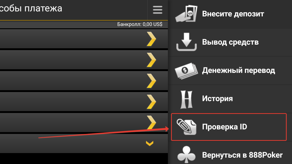 Верификация на 888Poker инициируется покер-румом, если игрок подает запрос на вывод средств. Однако покерист можно не дожидаться такого момента и сам пройти её, используя специальный функционал. Для этого нужно зайти в кассу на сайте комнаты или в покерном приложении и выбрать раздел Проверить ID. Там имеется функционал для загрузки файлов.