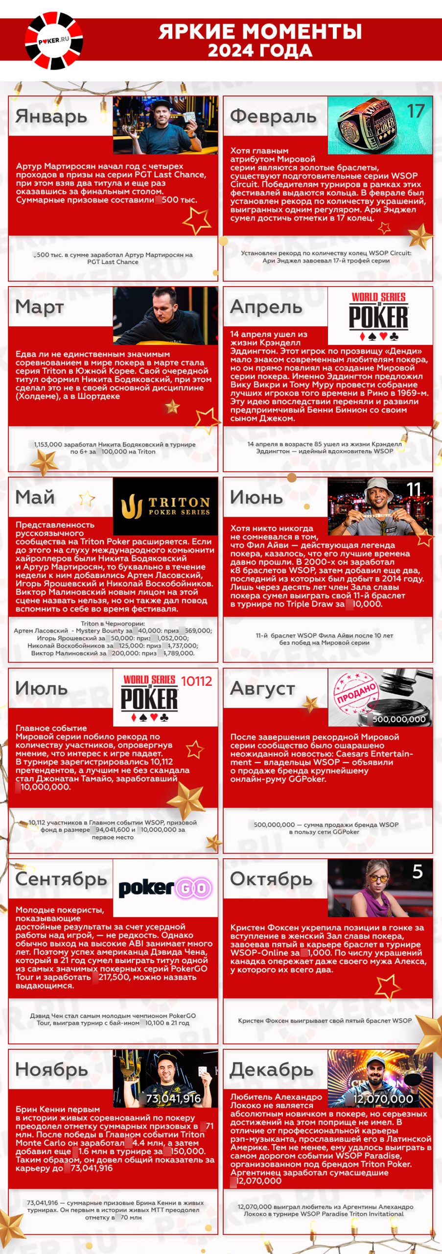 Хотя покерная индустрия работает без значительных пауз, завершение года дает повод обратить взгляд прошедшие 12 месяцев, чтобы вспомнить самые запоминающиеся события. Победы, достижения, рекорды и другие числа — в инфографике.